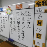 特別養護老人ホーム天の川明星のフロア、6月15日、お食事を目の前で作る『オープンキッチン』の日です。ご入居者様、ショートスティのご利用者様へのお食事です。 栄養士がフロアにコンロ、フライパン、器を持ちこんで、調理をします …