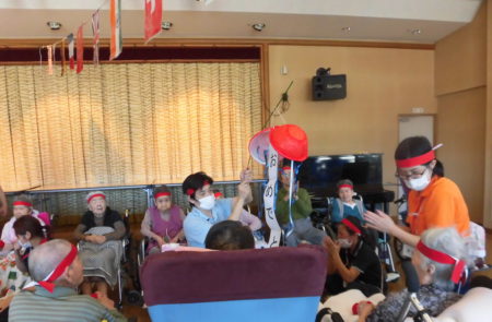 この競技はザルにボールを投げて、ザルを割ります。先に割った方が勝ち!入居者様はかなり力強い球を投げられます。