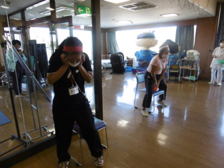 入居者様と職員の連携プレーでの風船割り-入居者様が運ばれた風船を職員がお尻で割ります。