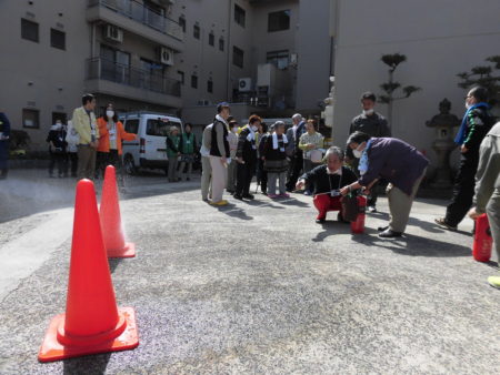 消火器を使って、消火活動の練習です。いざとなったら慌てそう。