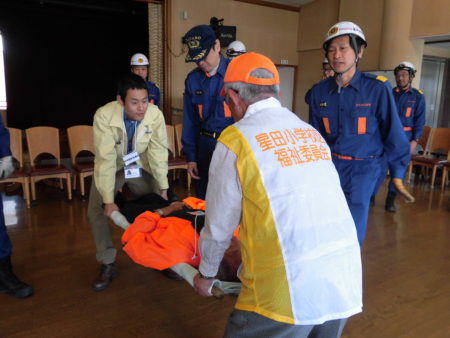 コミュニティホール星徳館にて、星田消防団さんから応急担架の