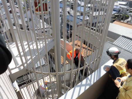 特別養護老人ホームに設置している「避難すべり台」で階下に降りる