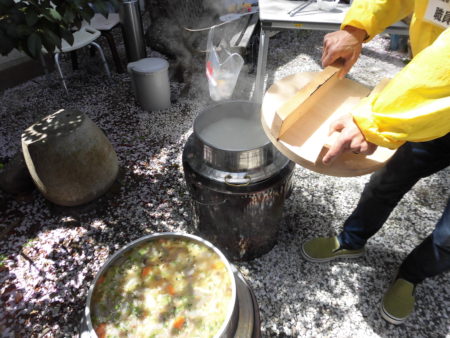 軽費老人ホーム中庭では羽釜で豚汁と炊飯を行いました。