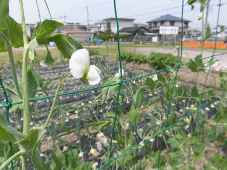 玉ねぎも顔を出し始め、さやえんどうも白い花が咲いています。