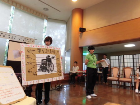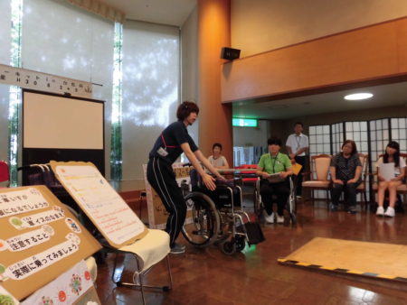 一つ目のメニュー「車いす体験」は特別養護老人ホームの介護福祉士2名が講師となり、車いすの動かし方の説明を行いました。