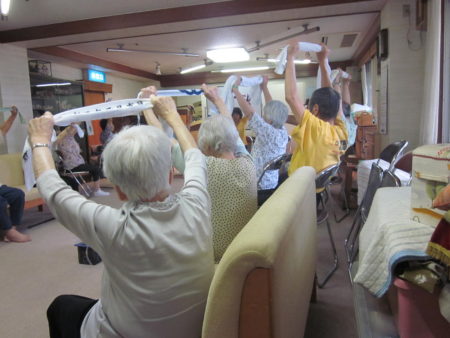 全身の筋をタオルを使って伸ばします。