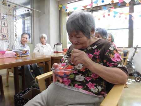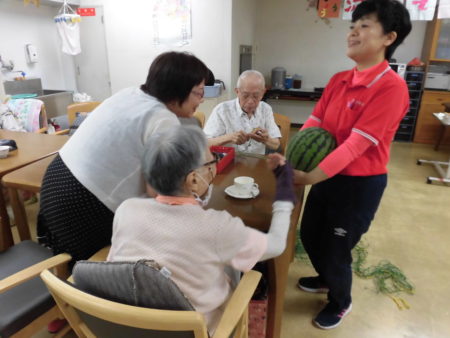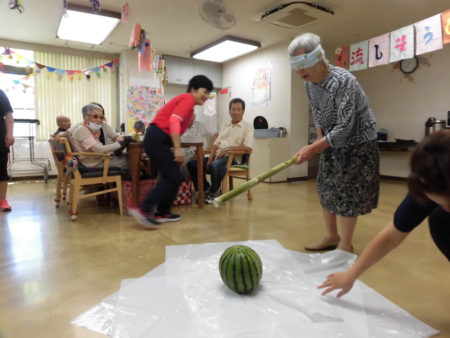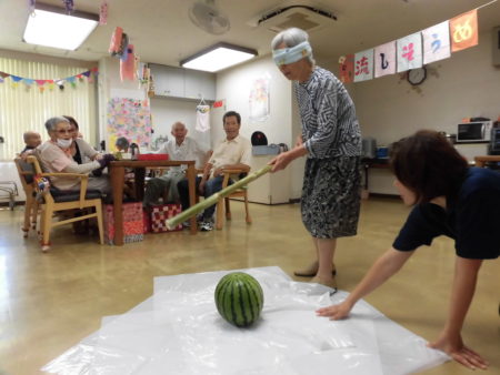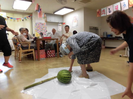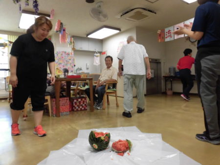 目隠ししては難しいー今度はタオルを外して挑戦!割れました!!途端に部屋にスイカの香りが広がります。「子どもの頃を思い出す香りやな~!」と誰かが言いました。