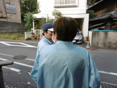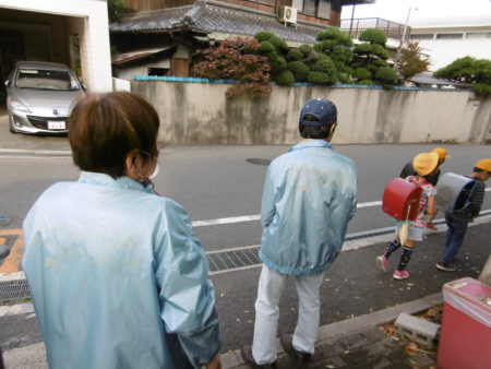 暖かな11月です。ある日の午後-軽費老人ホーム風景です。ご入居者様が下校する小学生を見守ります。薄くなって見えづらいですが、ジャンバーの背中には「星小校区見守り隊 おりひめひこぼし隊」と書かれているのです。たのもしいジャン!