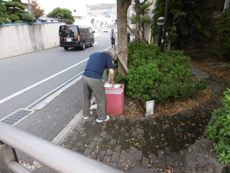再び門に戻ると、市民の方にペットボトルキャップを入れていただく専門箱のところでご入居者様が何やらしてらっしゃる ?