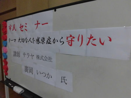 朝晩はめっきり寒くなり、いよいよゾクゾク・時期の到来です。インフルエンザにノロウィルス、食中毒だって夏ばかりではありません。感染症に罹ること、自分が感染源になることを防ぐこと。これらの知識をしっかり得ておくことが自分も自分の大切な人も護ることになります。軽費老人ホーム明星が「市民セミナー」を開催して今年で5年目です。前半をセミナー、後半は軽費老人ホーム明星の見学会です。セミナーは今年は「大切な人を感染症から守りたい」というタイトルでサラヤ株式会社さまにお願いをしました。講師は廣岡いつかさんです。