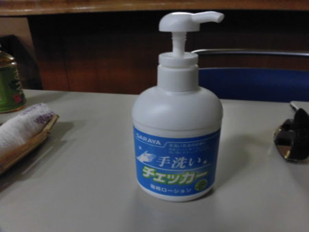 手洗いチェッカーという特殊な液体です。これを手に塗って、「普段しているように」手洗いをしてもらいます。