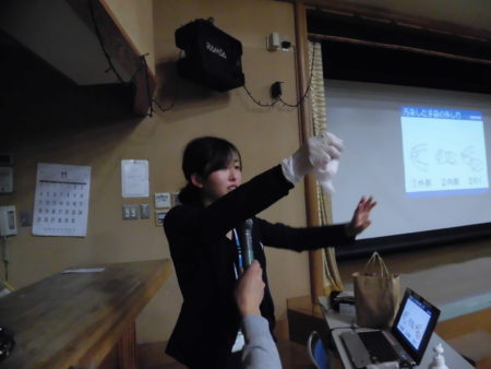 そのほか、手荒れは細菌の温床となるので、ハンドケアに留意すること、ペーパータオルはクチャクチャ・ゴシゴシではなく、『パタパタと押さえるよう』に拭くと効率よく手を荒らすことなく拭けることなども紹介されました。参加の皆さんは「早速帰ったら手を洗うね!」「ハンドクリーム塗らないと、、。」などとおっしゃっていました。ご希望の方は館内のご見学ツアーに行かれました。みなさん、インフルエンザやノロウィルスに罹らず、元気な楽しい冬を過ごしましょう!