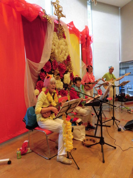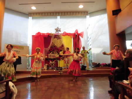 演奏をバックにフラダンスを踊るは、天の川デイサービスセンタースタッフの女性たち!仕事を終えてからフラダンス倶楽部を作り、「はい!お稽古~~しましたあぁぁ!」
