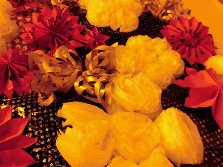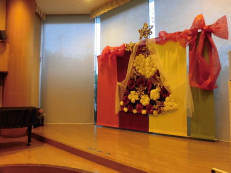 さて、この舞台のバックに話題を移しましょう。高さは約3メートル、幅は約5メートルあります。 デイサービスセンター天の川のスタッフが2週間余を掛けて作成しました。