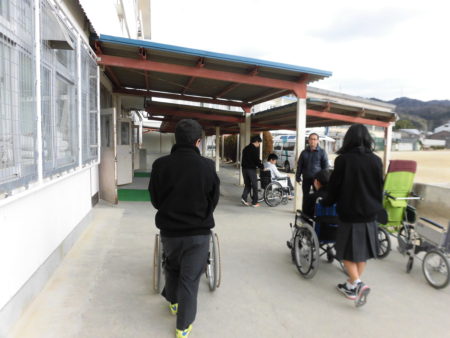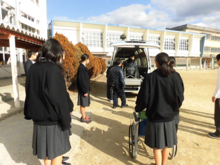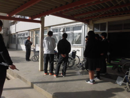 第二ステージは外に出て実習ー『車いすの体験』です。この中で車いすに触ったことのある人?「はーい!」と7割の生徒さんが手を挙げていました。小学校、病院、で経験しました、とのことです。案外多くて驚きました。