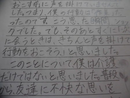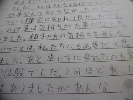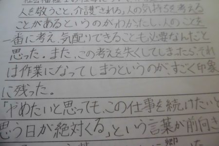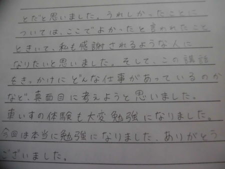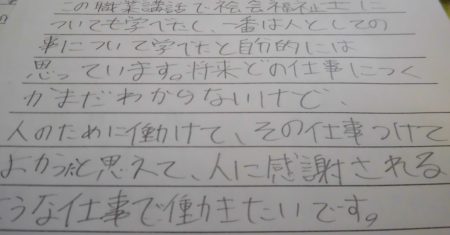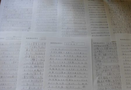 皆さんの文章を読んで、こんなにしっかり聴いて、しっかり感じて、しっかり解って、しっかり考えてくださっていたのか、と驚いています。こちらのメッセージがこのように伝わったことに喜びをもって読ませてもらい、涙がにじんできました。こんなにやさしくたくましいみなさんが「福祉」に心を寄せてくださり、将来が楽しみになってきました。