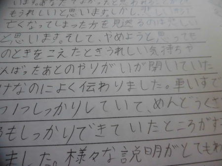 みなさんから丁寧なご案内や紹介、ご挨拶をいただいて職業講話は無事に終わったのでした。そして、8日後の今日2月1日、生徒さんが書かれた感想文が中学校から届きました。