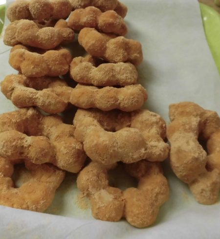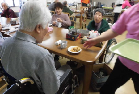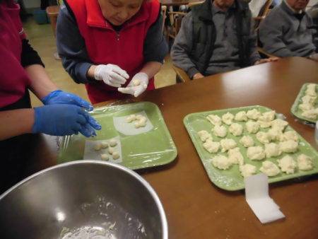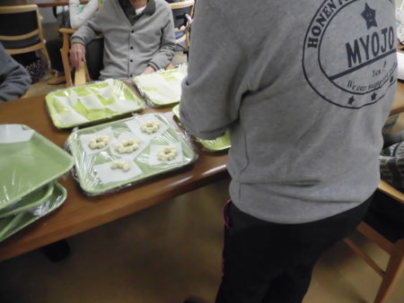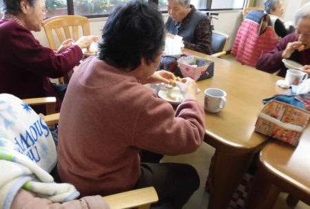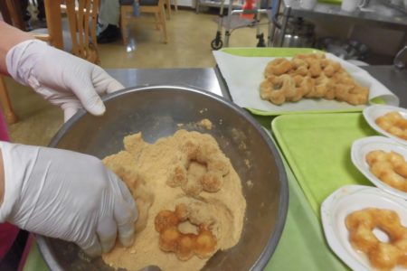 今週、デイサービスセンター明星では誕生日会が行われています。毎月お菓子などを手作りして、長寿のお祝いを皆で行っています。今日のお祝いはNさん、90歳を超えてらっしゃる素敵な笑顔の女性です。そしてお祝いの席を彩るメニューは「ポン・デ・リング風のドーナッツ」を手作りします!