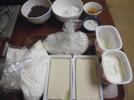 ホットケーキミックス、白玉粉に豆腐を入れて捏ねて、そこにヨーグルトを入れてさらに捏ねます。