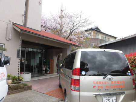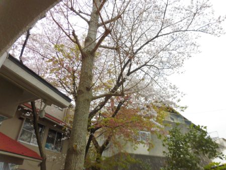 軽費老人ホーム中庭の桜が咲き始めました。新しい門出のみなさんを応援し歓迎しているようです。