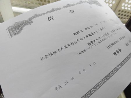 花冷えの今日、2019年度がスタートしました。当法人でも新規採用される職員に理事長より辞令交付されました。正規雇用になる職員、人事異動の職員等8名が緊張と期待の気持ちをもって理事長室前で待機している光景が新年度4月1日の恒例です。法人内の全職員誰しもがかつてこの日を経験し味わっているのです。気持ちが引き締まり、洗われるひと時です。