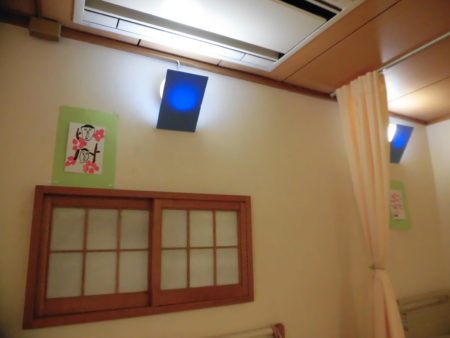 疲れたらお休みいただくベッドのはライトが明るすぎて、スタッフが工夫して間接照明にしました。月夜のイメージです。夜桜を想ってくださるといいな~