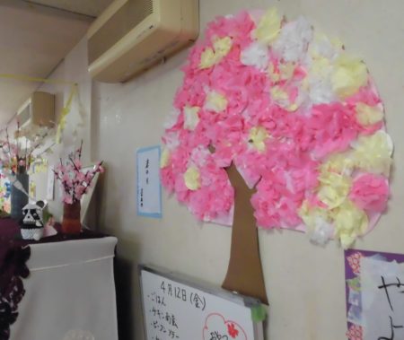 デイサービスセンター天の川のデイルームは花盛りです。ご利用者さまが作られた桜の木が満開になっています。
