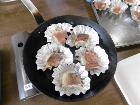 魚はあらかじめ、スチームオーブンで加熱してあります。それをフライパンで焼いて行きます。
