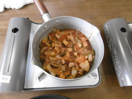別のお鍋では上から掛ける野菜のトマトソースが沸々と煮上がりました。茄子、玉ねぎ、ピーマン、と栄養のバランスを考えています。