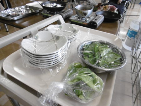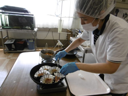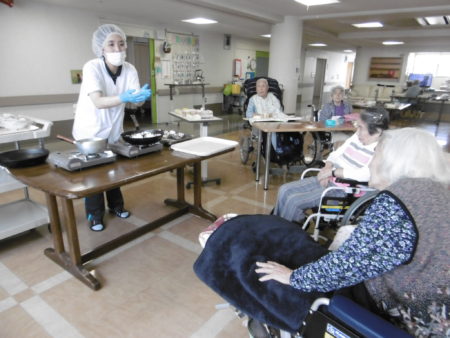 栄養士がフロアにコンロ、フライパン、器を持ちこんで、調理をします。今日のメインメニューは魚のホイル焼きです。魚が焼ける香り、ジュワ~という音、調理のプロセス、、、月に一度の機会を楽しみになさっているそうです。女性は昔、お料理をなさっていたので、興味しんしん!調理する栄養士は「緊張シマス!」と笑顔です。