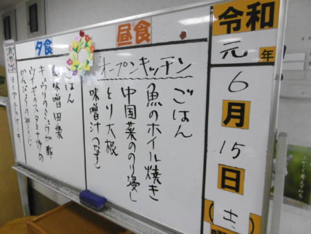 特別養護老人ホーム天の川明星のフロア、6月15日、お食事を目の前で作る『オープンキッチン』の日です。ご入居者様、ショートスティのご利用者様へのお食事です。