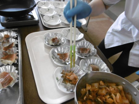 栄養士が魚の中心温度を測り、火の通りを確認します。「OK!!出来ました!」