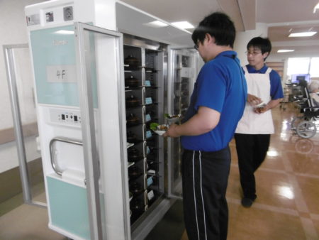 介護スタッフがセッティングをしていきます。オープンキッチンも栄養課と介護スタッフとの協働でご入居者様に提供できています。出来立てを召し上がっていただいて、楽しそうなお顔がうれしいです、とのことです。