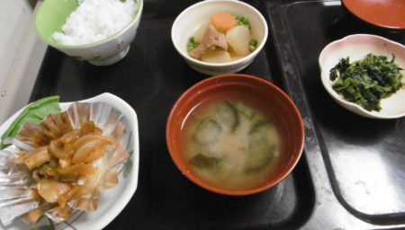 出来上がりました!ホイル焼きの他に、菜っ葉の海苔浸し、鶏肉の大根煮、茄子のお味噌汁が本日のランチメニューです。