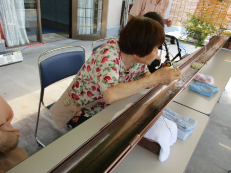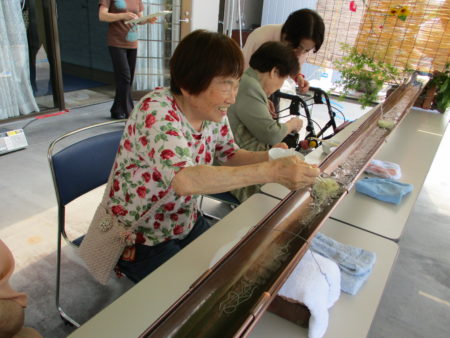 器がいっぱいになっても流れてくるそうめんを見て「待って、待ってー」と笑い声が絶えません。「おつゆ足しますね~」と相談員。「流しそうめんは久しぶりで、楽しみました!」