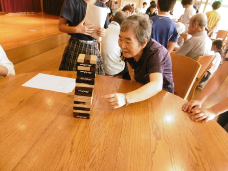 テーブルごとに、ゲームが行われます。美味しそうなチョコレート?ではなくて、『ジェンガ』なのです。落とさないように、ゆっくり~ゆっくり~ね!「おばあさん!ガンバレ!」と声援が送られます。