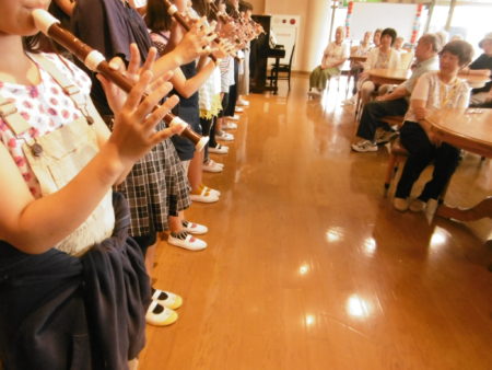 全員でリコーダー演奏を!リコーダーは「小鳥のように歌う」という意味が一説にはあるそうです。ほんと初夏を思わす懐かしみのある音色でした。みんな懸命に練習してくれたね!ありがとうございます。