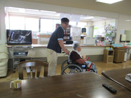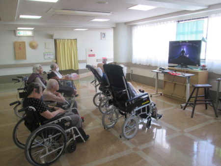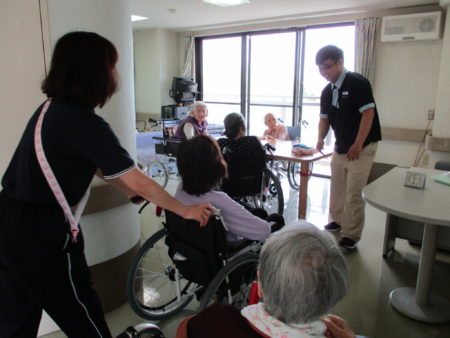 いつもの昼食はデイルームで、なのですが、今日は特別の空間に移動することになりました。スタッフが誘導します。 ワクワク♪♪スタッフもワクワク!!