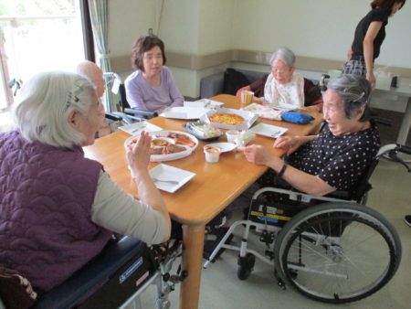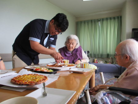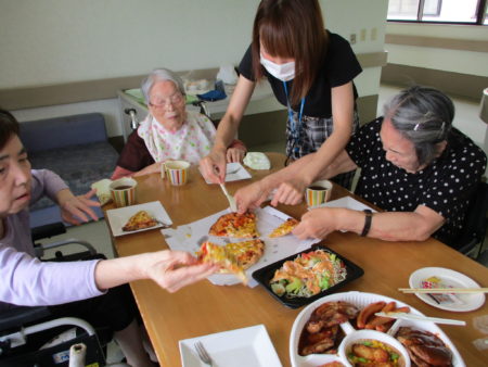 みなさん、ピザがお好きです。スタッフが切り分けたものを配ってくださるご入居者さま。あっという間に売り切れ状態!「は~い!貴女の分よ!」