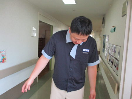 本日の終わりに、、、、。こちらはこの階のフロアーリーダーです。「このユニフォームはみんなで選んだ新しいバージョンです。アクセントにネクタイ風が付いています。ユニフォームはいくつかのパターンがあります。」