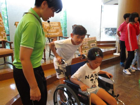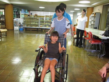 今年は絨毯敷きのフロアでも車いすを押してみました。毎年来てくださっている子どもさんは新たな体験で喜んでおられました。そうですね、車いすで通るところは何もフラットな場所ばかりではないですからね。本当は「実際の道」に出てみたい、とある子どもさんのご意見でした。
