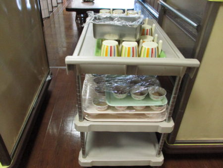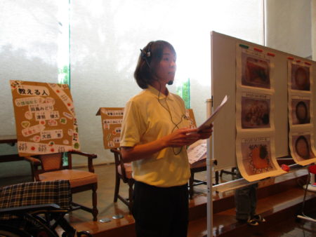 今年初めて参加-明星栄養課の栄養士による「高齢者になると飲みこみにくくなる-そして飲みこみやすいような食事の形とは」をお話ししました。みんなの前にはオレンジジュースのふつう、トロミをつけたもの、ビスケット、ミキサーにしたビスケット、ゼリー状のお茶、が配られました。