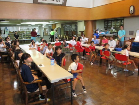 特別養護老人ホーム天の川明星の介護主任による車いすの講座です。今年で2度目、まずは車いすを押す前に車いすの各パーツの名称を覚えましょう!ブレーキ、シート、フットサポート、バックサポート、、などなど。子どもたちは案外早く覚えるものですね、びっくり!