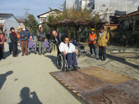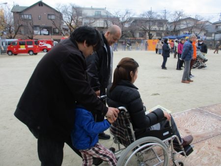 晴天と暖かな気温に恵まれた12月8日、交野市・天野が原町で防災訓練が行われました。天野が原町自主防災会様の主催で当日は200名を超す参加がありました。煙道体験、消火器訓練、AED操作、応急救護などのいくつかの体験コーナーのうち『車いす講座』を豊年福祉会が担当させていただきました。