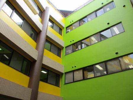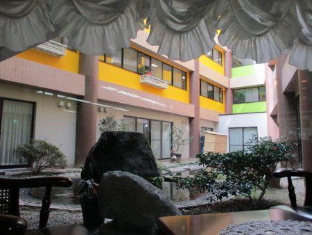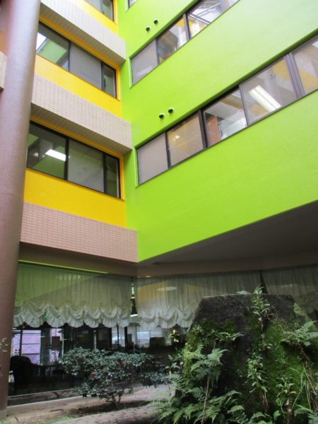 藤が尾にある豊年福祉会・天の川明星では昨年から外装のお色直しをしています。さて、こちらは中庭なのですが、このたび鮮やかな黄色と緑に生まれ変わりました。
