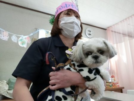 はじめまして!『らぐ』です。「ボク、犬なんだけど今年の干支(エト)にちなんで、ウシさんのお洋服を着てるヨ!なんて鳴いたらいいのか、ワンワン!なのか、モ~~♪なのか、ときどき迷ってしまうんだ、、、。」