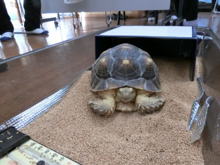 甲板には成長輪と呼ばれる模様があります。砂漠の周辺やサバンナに生息していて、ケッちゃん、「ワタシ、さむいの苦手なので、今日は動物飼育員だったHさんが用意してくれた「ゆかだん」の上にオリマス。砂みたいに見えているのは、ココナツの殻を砕いたもの。その下には使い捨てカイロを敷いてもらって、その下には断熱シート、、、ワタシ大事にされちゃって、、、!ヌクヌク♪」