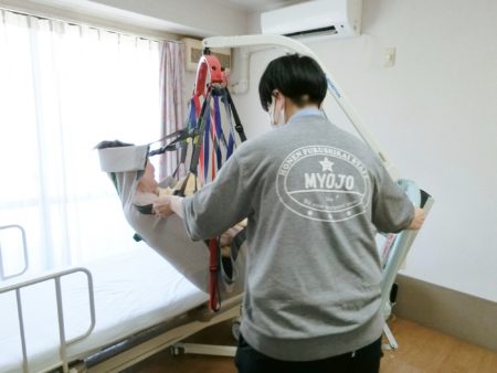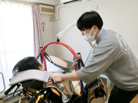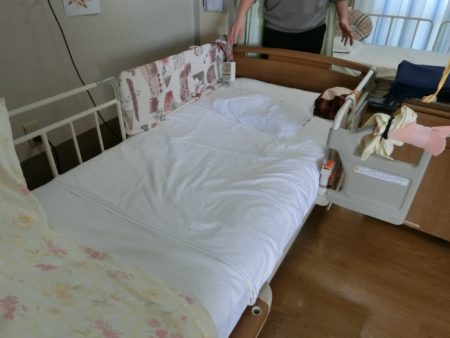 スリングシートを外して無事にベッドに移っていただくことができました。慣れるまで少し心配でしたが、比較的短期間で職員は習得できたように思います。やはり職員の負担が軽く、少なくなったと実感しています。