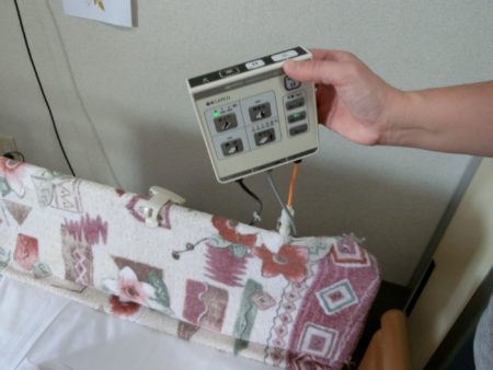こちらは、2018年より導入しているご入居者様の転倒や転落を防止するための機器です。ベッドに内蔵したセンサーが荷重の変化を検知します。ベッド上の人が起き上がった時、立ちあがるとき、端座位を取ったとき、ベッドから離れたとき、などを検知してステーションにお知らせする、というベッドなのです。