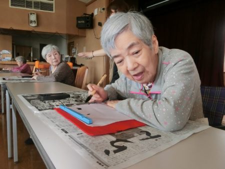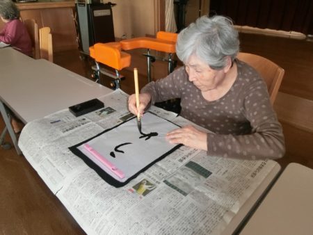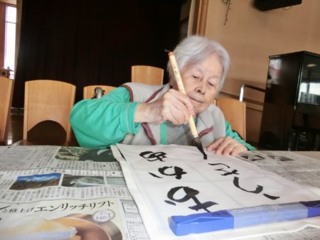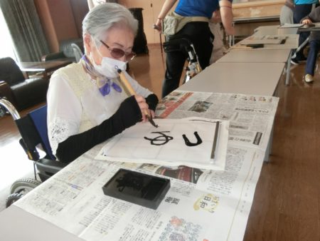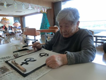 特別養護老人ホーム明星では「お習字の日」を始めて7~8年になります。当初はご入居者様お一人お一人好きな字を書かれていましたが、昨年から「力を併せて」の合同作品にチャレンジされています。町や山が見渡せる「星徳館」で行われ、スタッフが会場にお連れします。